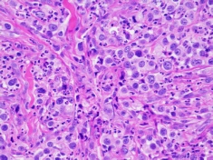 Biopsy (histopathology) from a dog’s mast cell tumour (high grade). Features like the rate of cancer cell division, and invasiveness of normal tissue allow the pathologist to ‘grade’ the tumour and predict its behaviour. The ‘completeness of excision’-