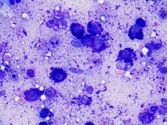Cytology (the study of cells) involves examining cells removed from the cancer with a needle (called a fine needle aspirate or FNA) to see what type of tissue has caused the tumour. Cytology is relatively inexpensive, can often be done without an anaesthetic and with minimal distress to your pet. The cells are placed on a glass slide and stained with special dyes to allow the pathologist to look at their shape and features using a microscope. Cytology allows the pathologist to distinguish cancer from other diseases which might look like cancer, such as infections. When cancer is present the pathologist is often able to determine the broad classification of cancer (mesenchymal/sarcoma, epithelial/carcinoma or round cell tumour) which is important in deciding treatment options, as well as whether the tumour is benign or malignant. For some cancers the cytology diagnosis can be more specific, particularly mast cell tumours, melanoma or lymphoma which are common in dogs. Cytology is often the first step recommended by your veterinarian in diagnosing and managing your pet’s cancer.